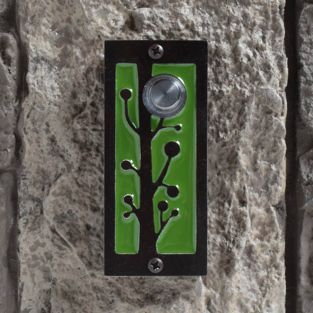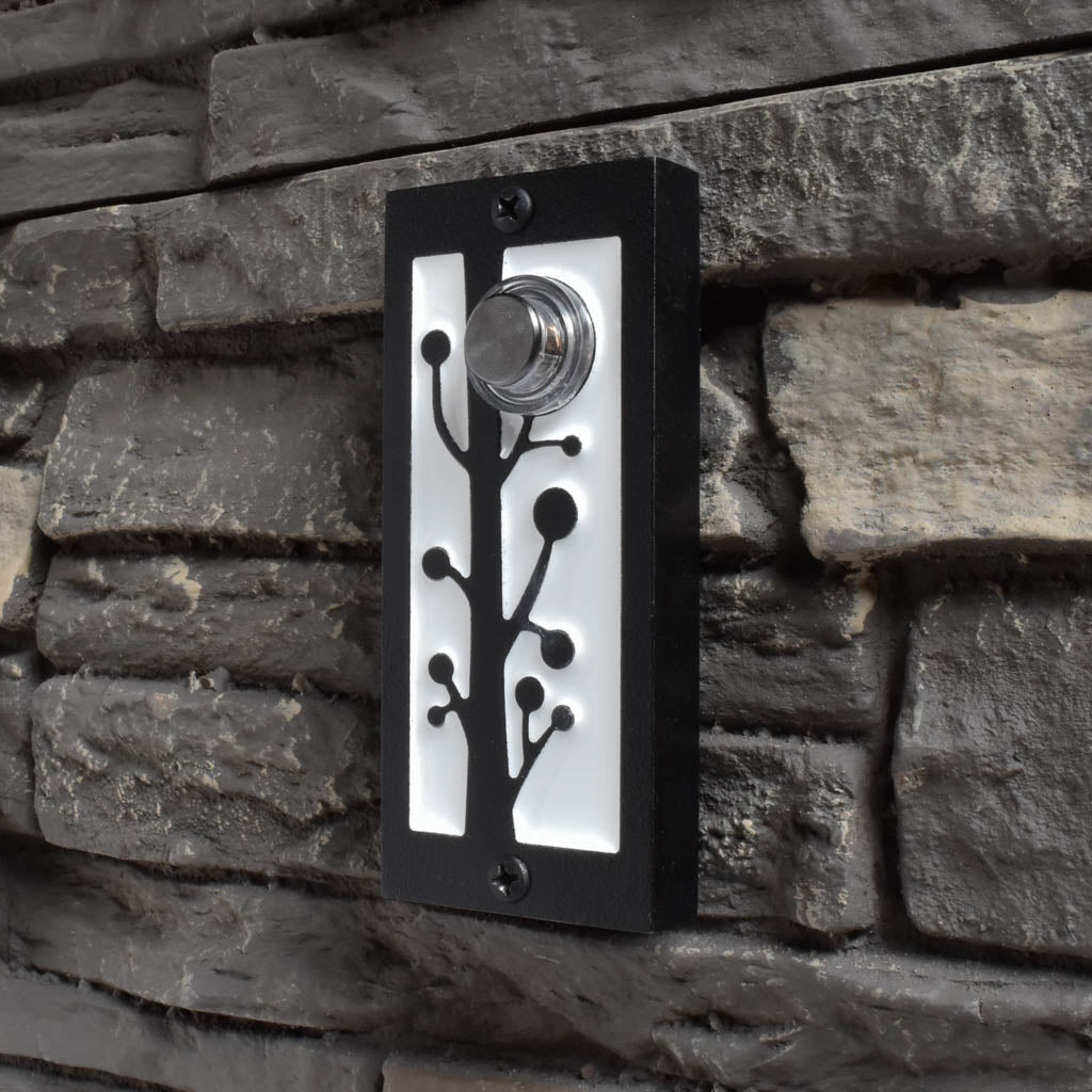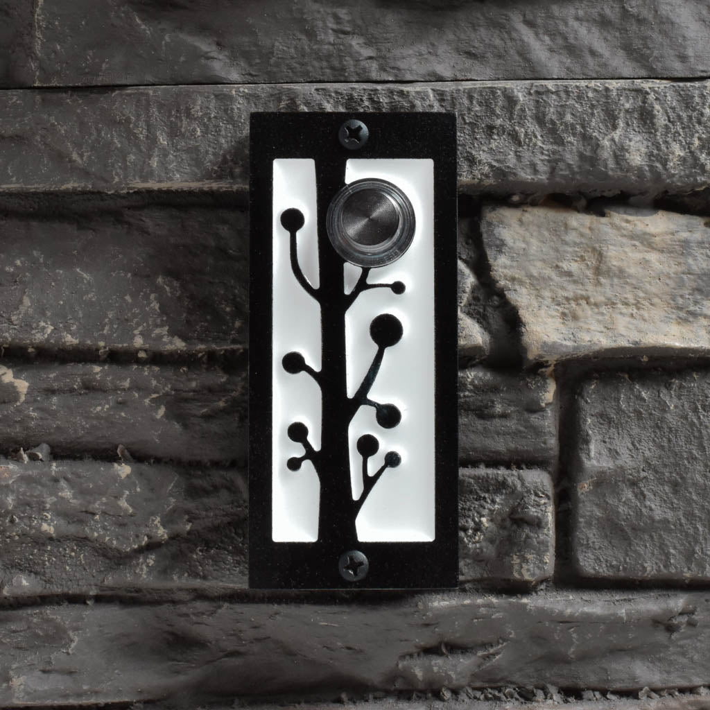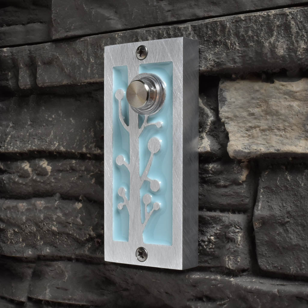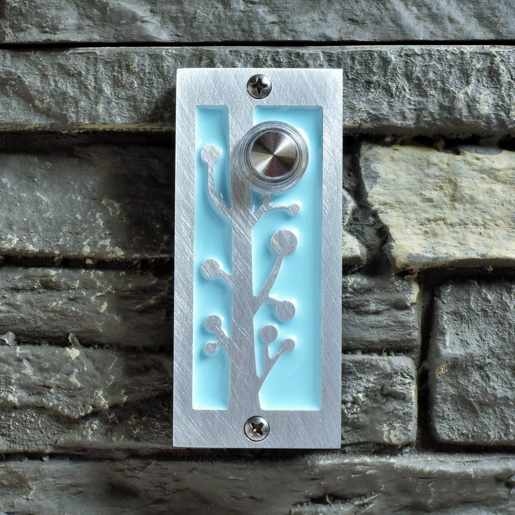 Stand out among the forest with this abstract interpretation. The tree outline is shown in silhouette in an aluminum, black or bronze patina finish with your choice of resin color. The button is backlit with a white LED light.