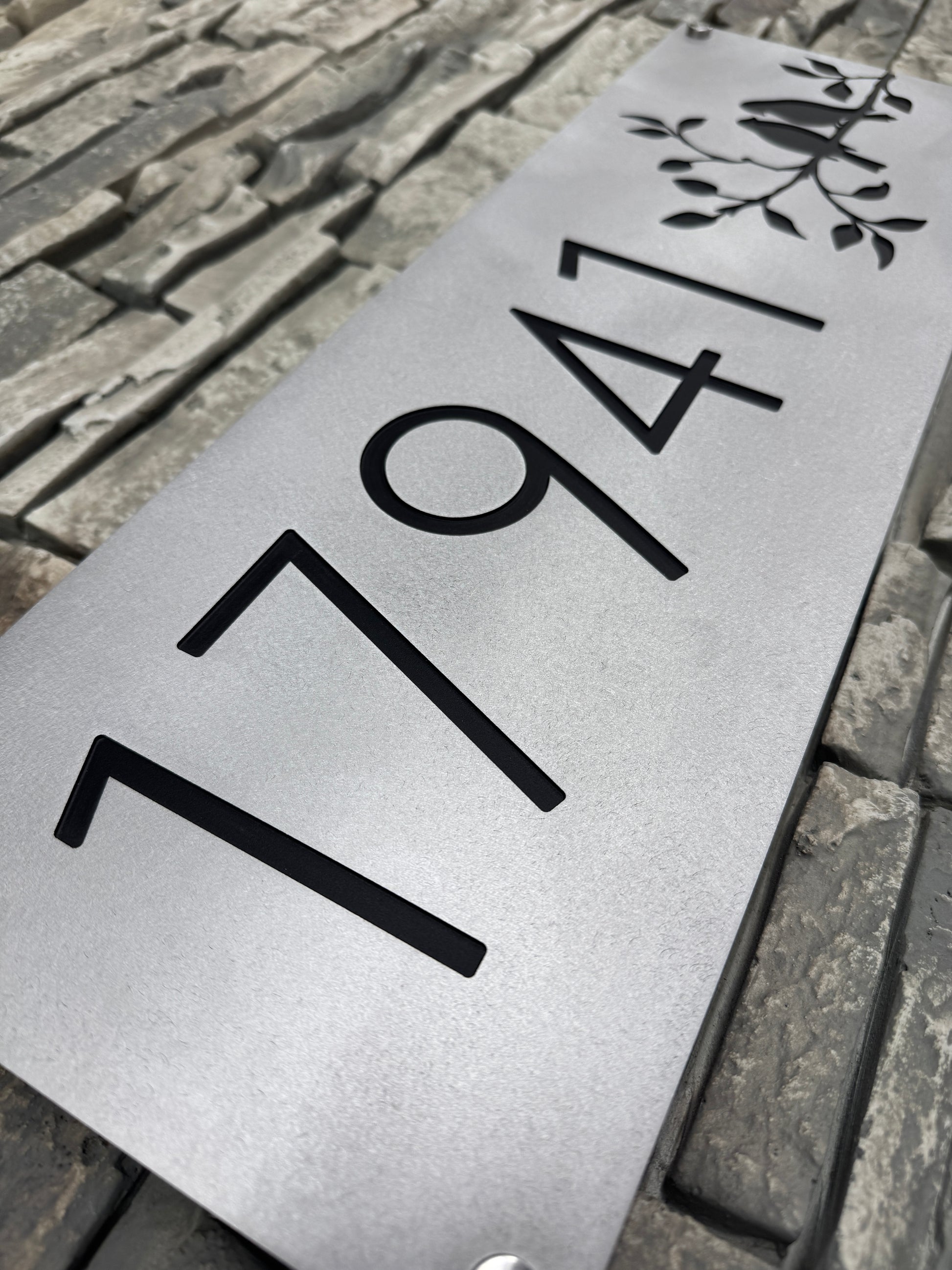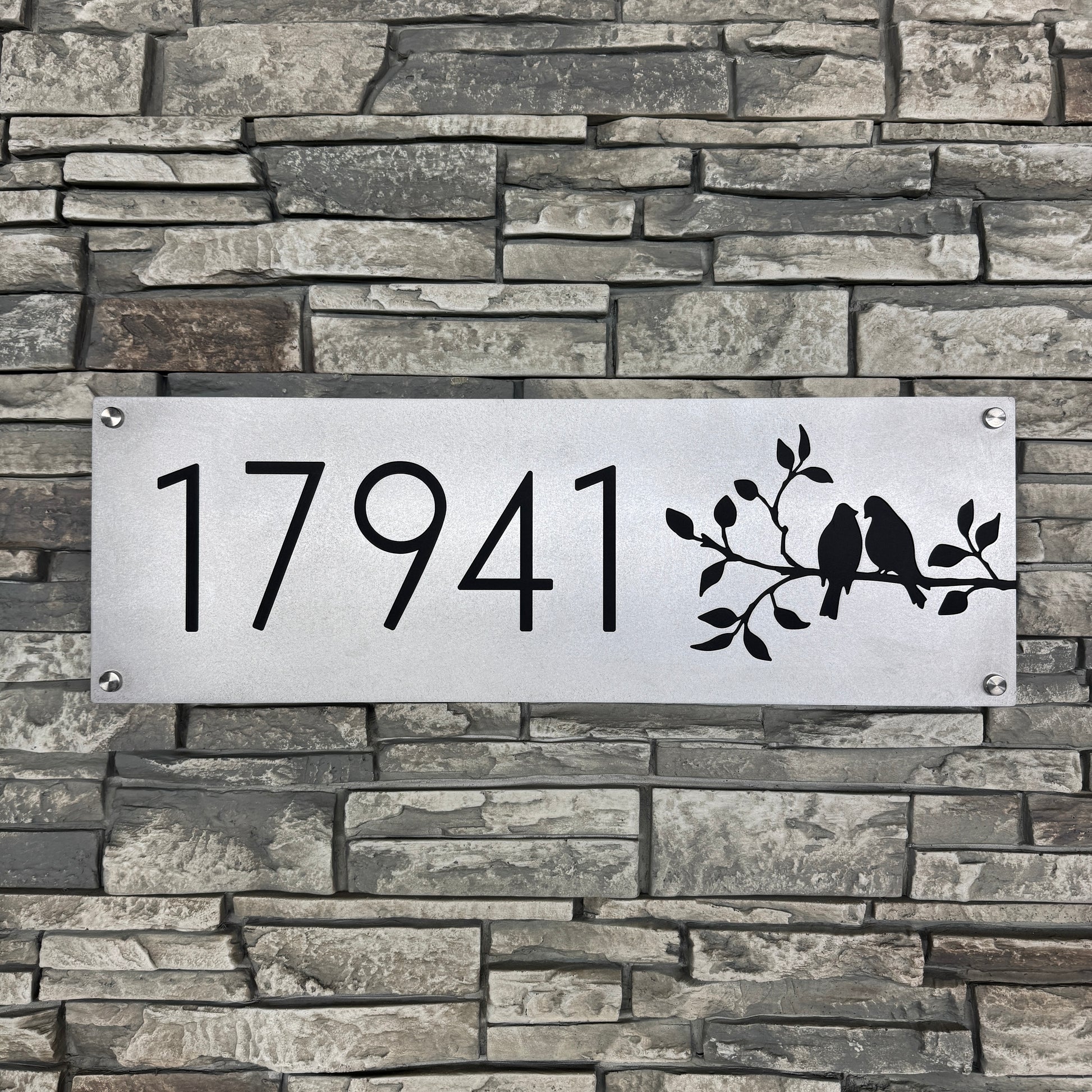Brushed aluminum finish. Choose black or brown coloring for the numbers and bird design. Matte UV clearcoat applied.