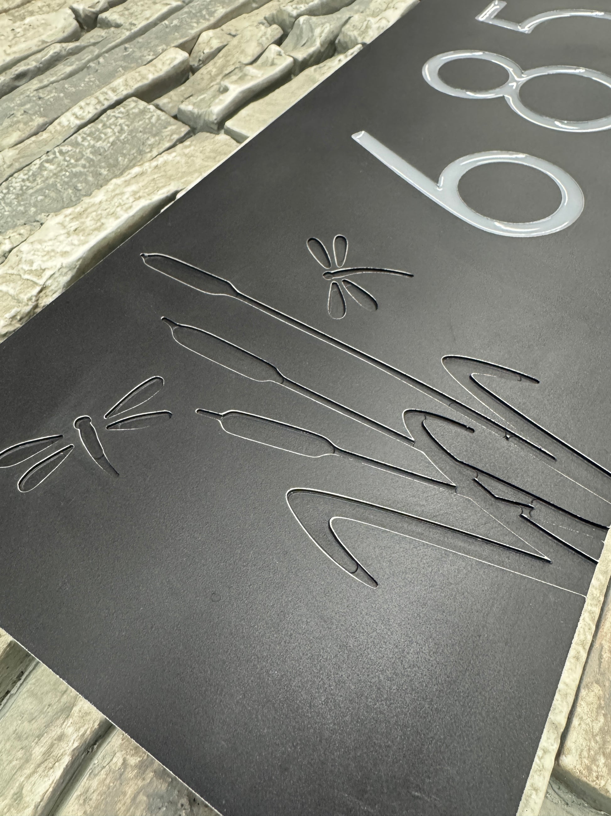Black or brown metal plate finish with matte UV clearcoat applied. Design is lightly sand for a subtle appearance. Choose a resin color to make the numbers pop.