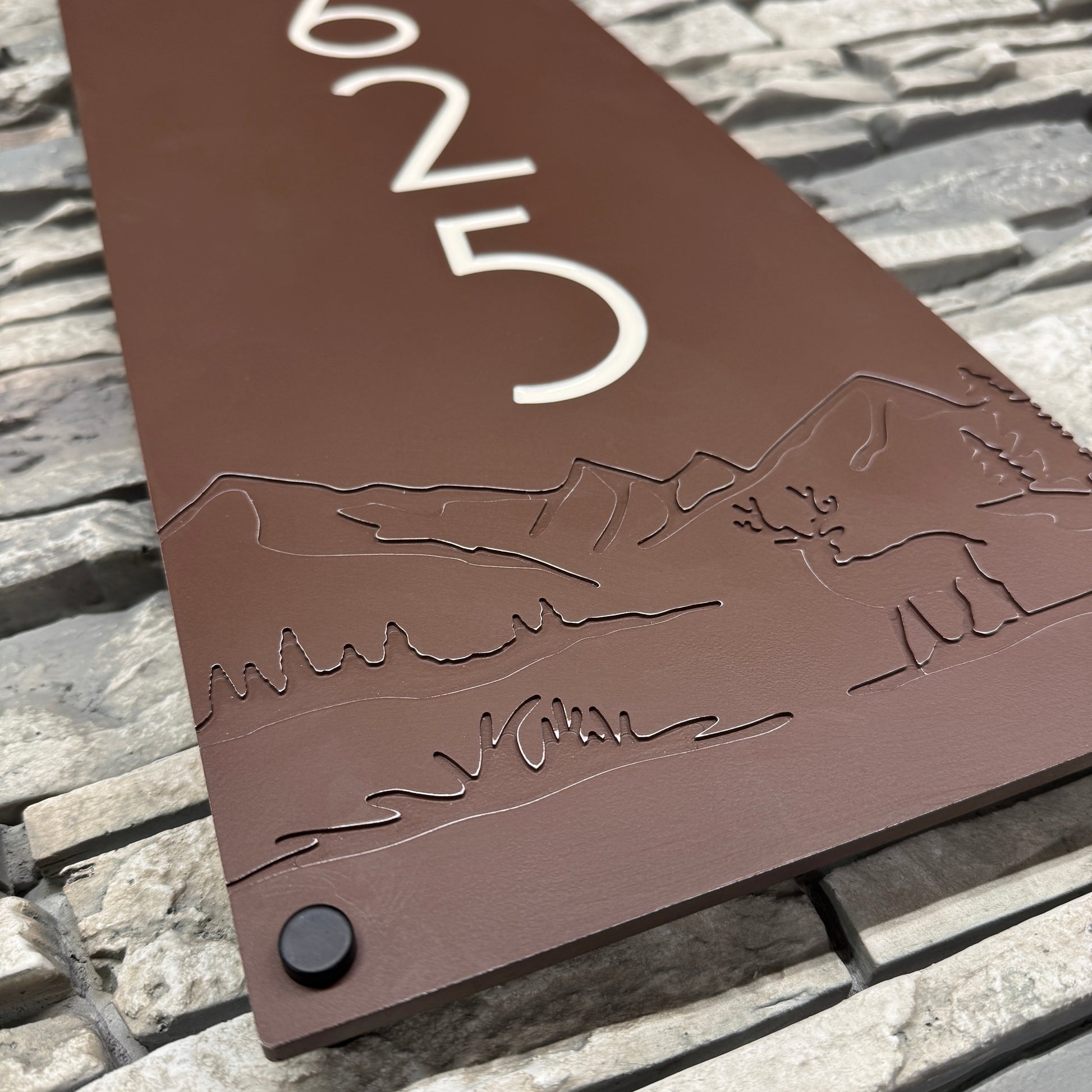 Black or brown metal plate finish with matte UV clearcoat applied. Design is lightly sand for a subtle appearance. Choose a resin color to make the numbers pop.