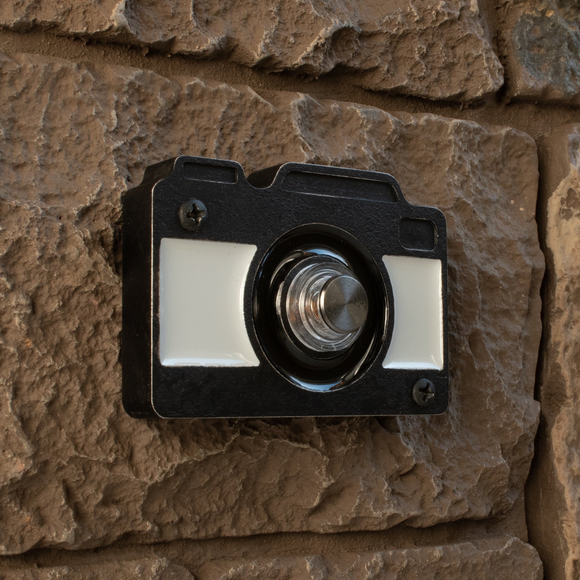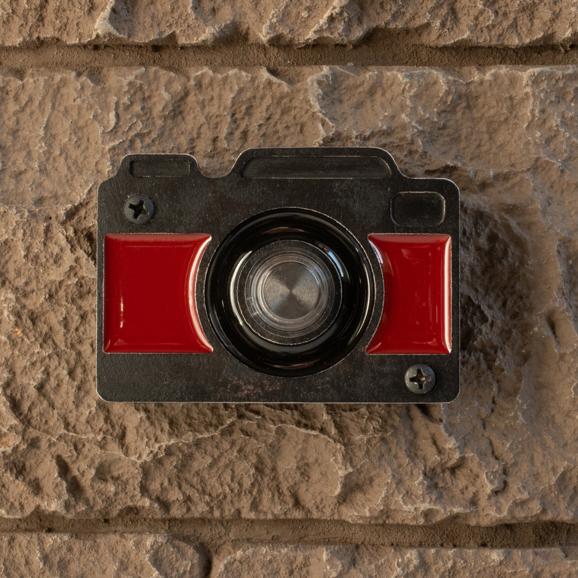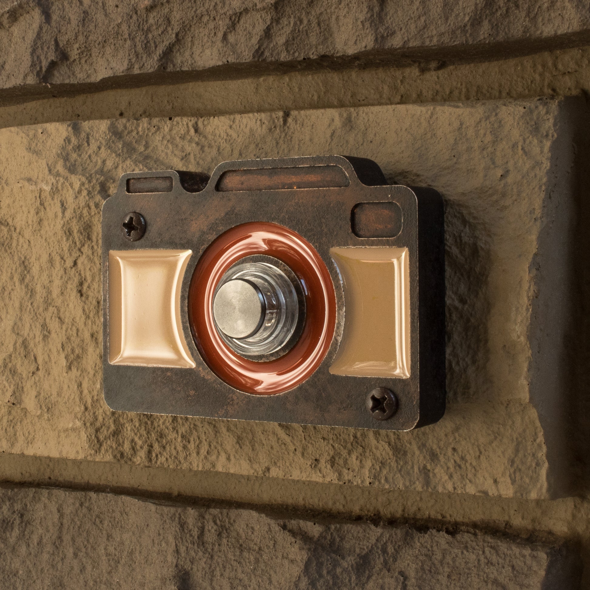 This vintage camera doorbell will have you posing for pictures! Customize with your choice of 2 resin colors: first color is the main camera color and the second (accent) color is around the shutter. Choose an aluminum, black or bronze patina metal finish. The push button replicates the shutter and is backlit with a white LED light. (Note this doorbell does not actually take a picture.)