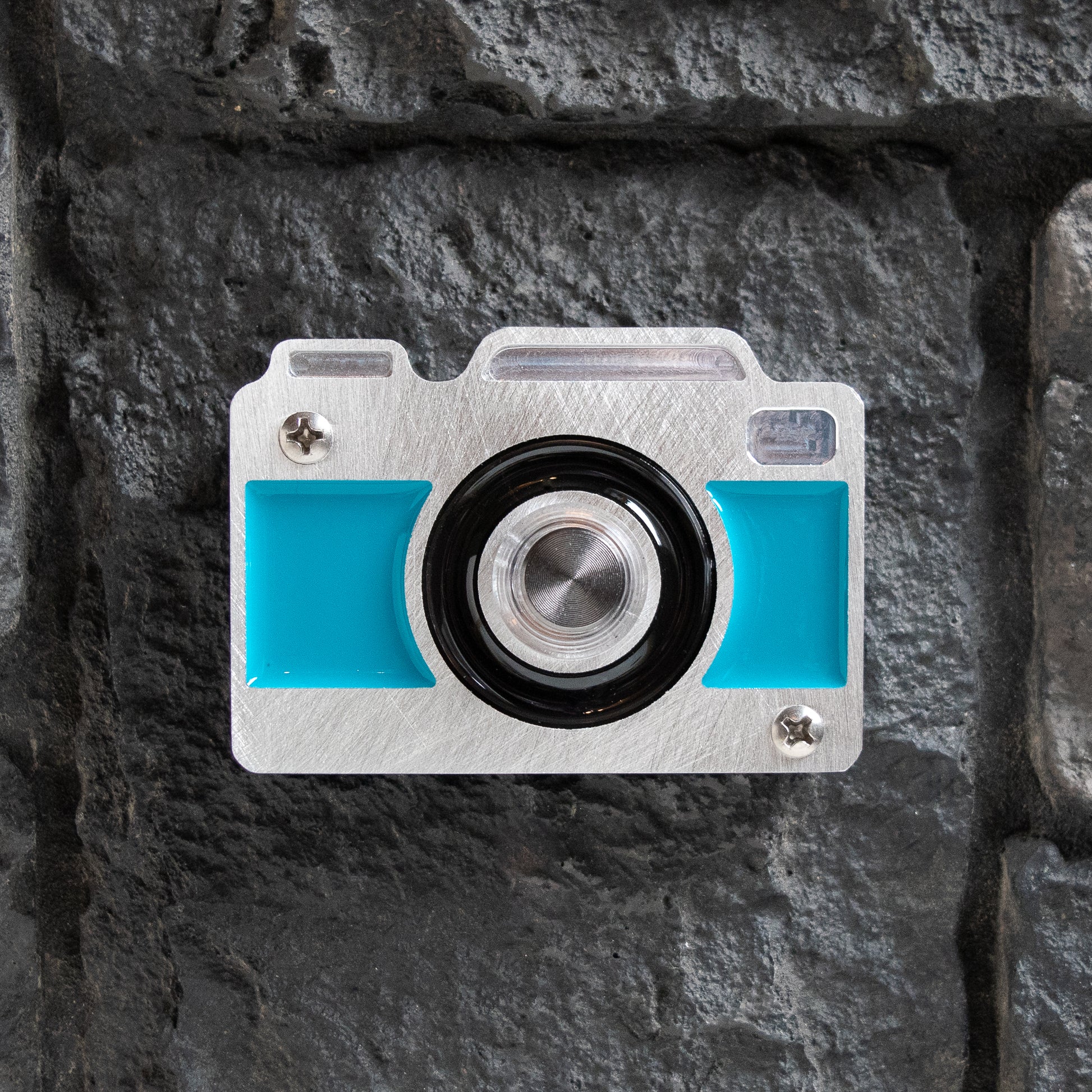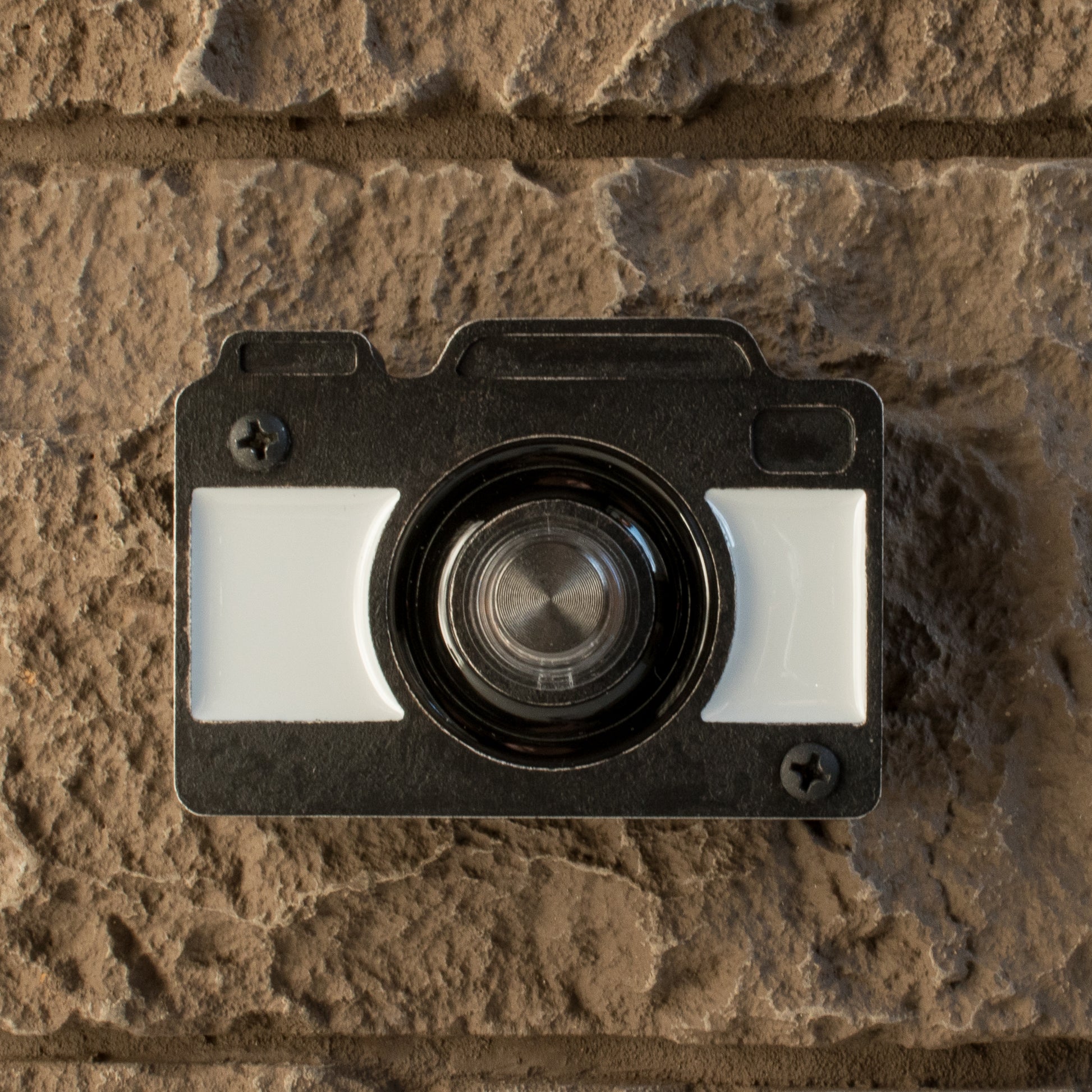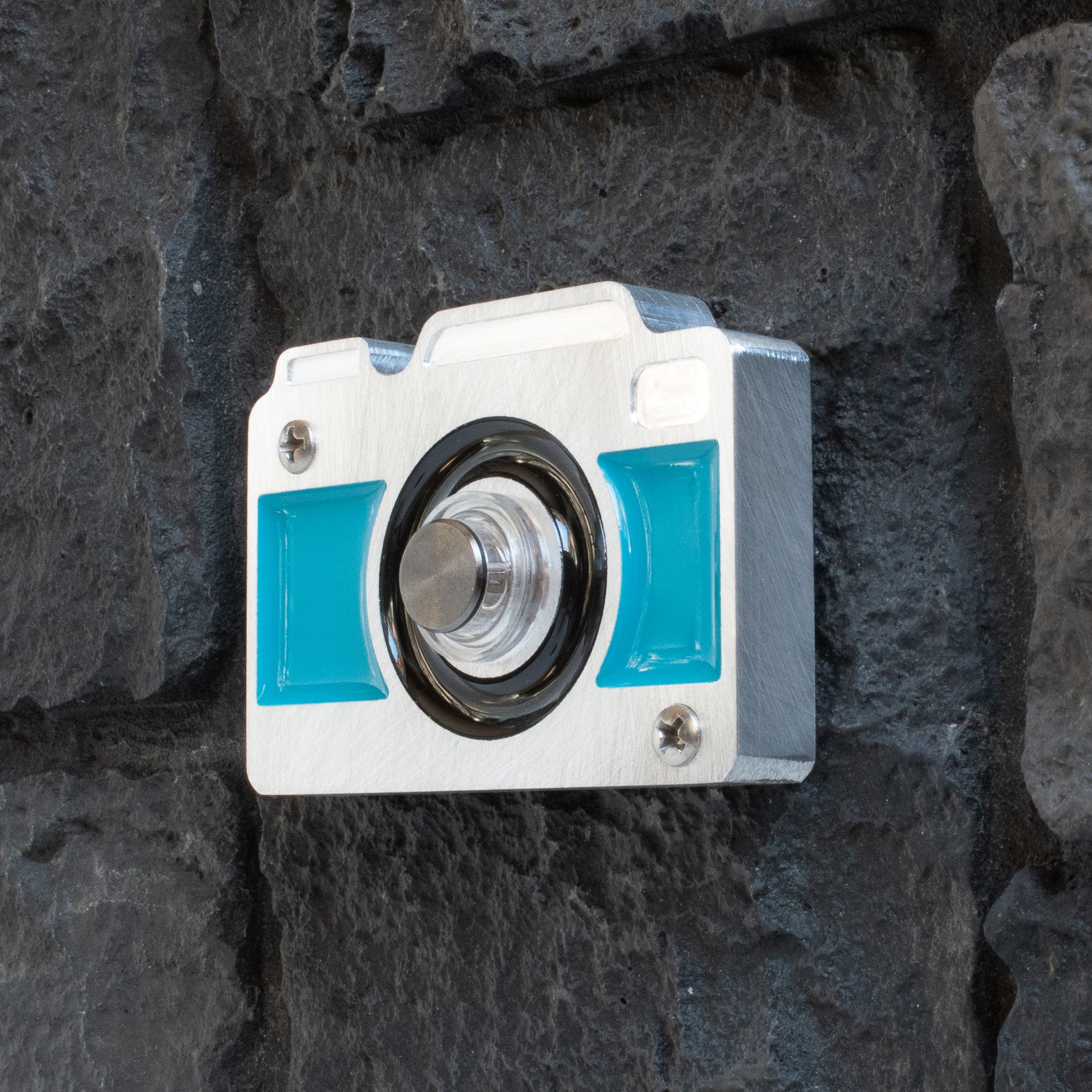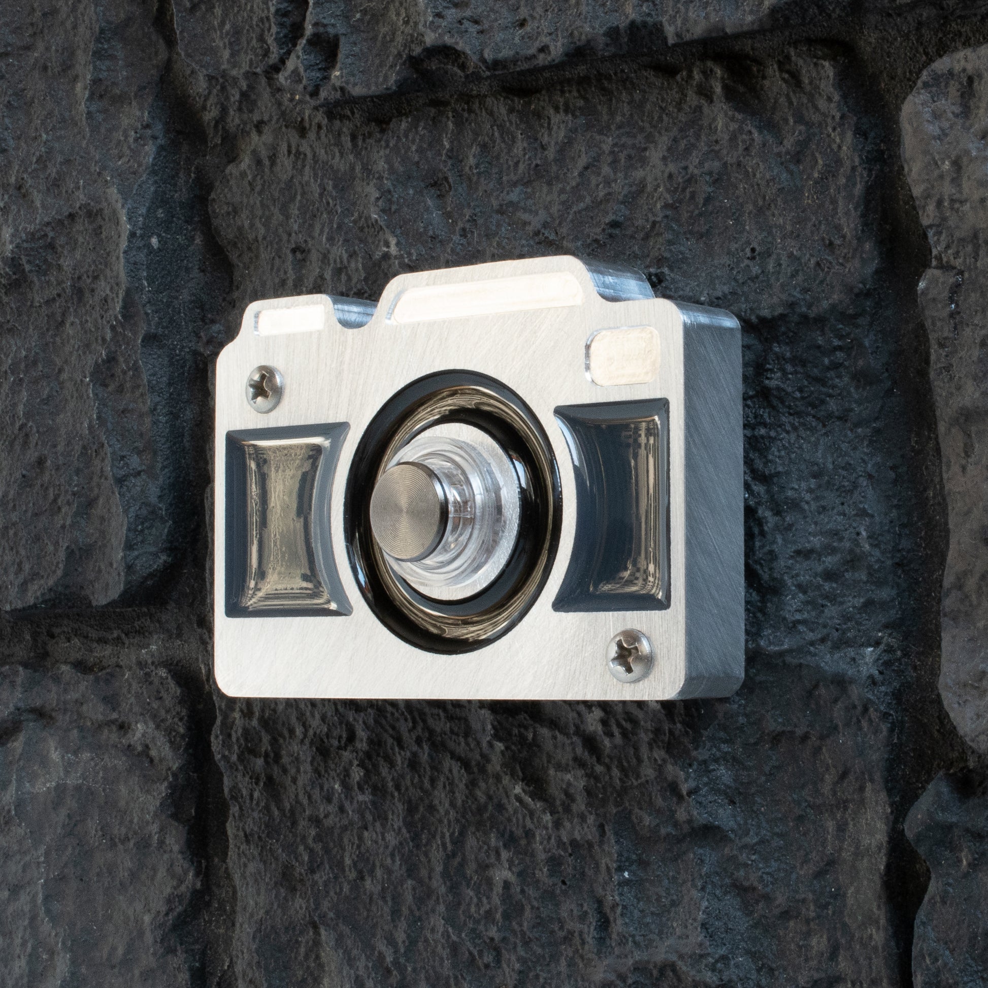 This vintage camera doorbell will have you posing for pictures! Customize with your choice of 2 resin colors: first color is the main camera color and the second (accent) color is around the shutter. Choose an aluminum, black or bronze patina metal finish. The push button replicates the shutter and is backlit with a white LED light. (Note this doorbell does not actually take a picture.)