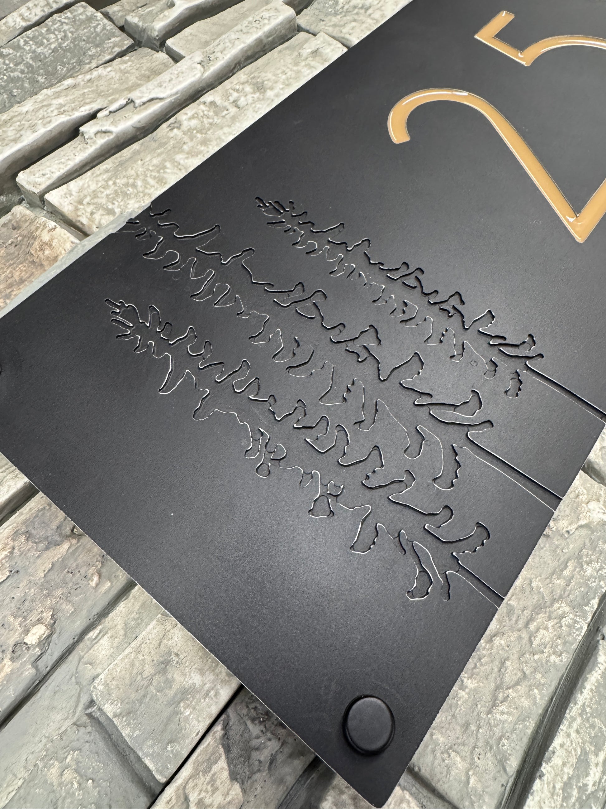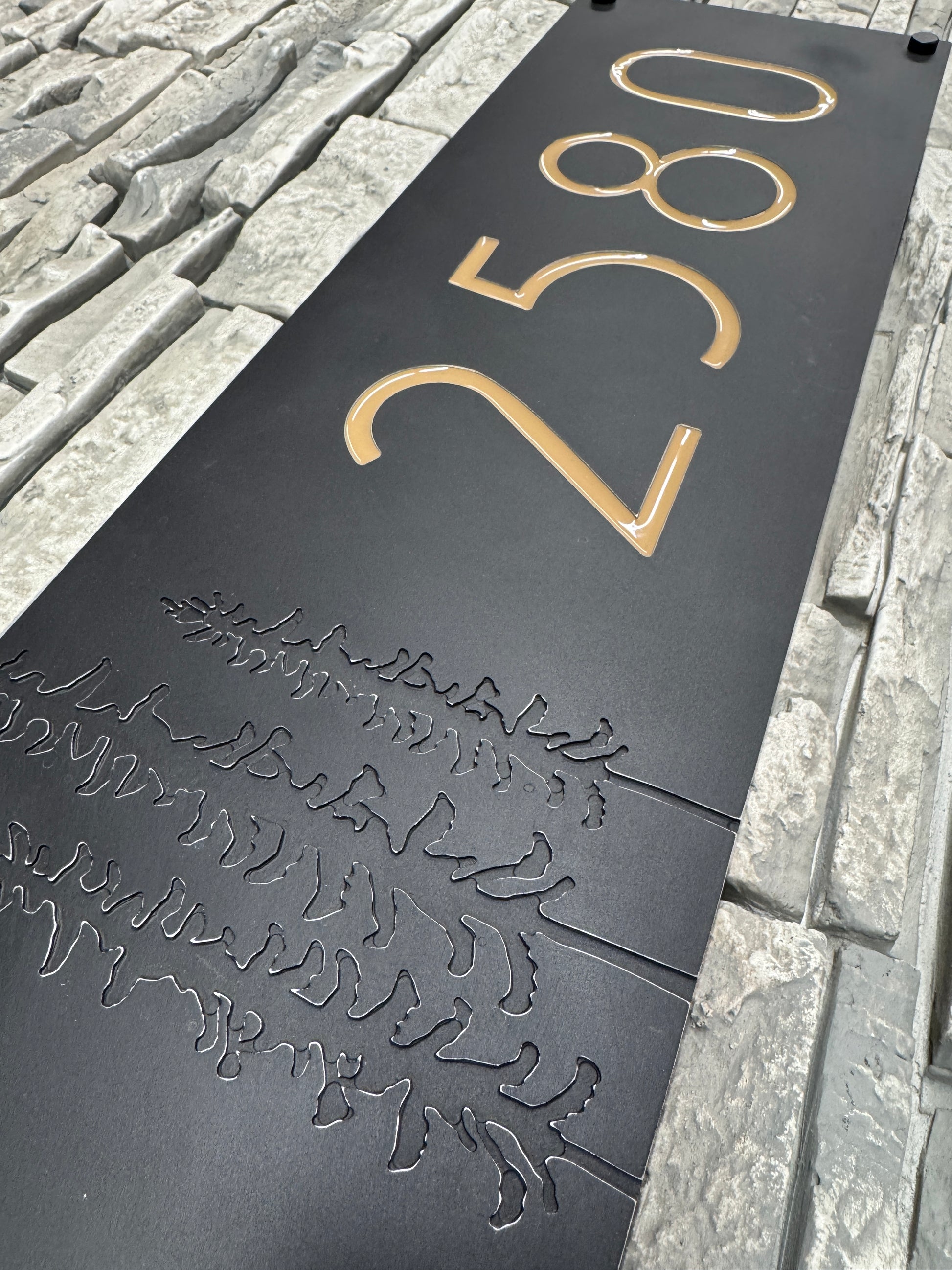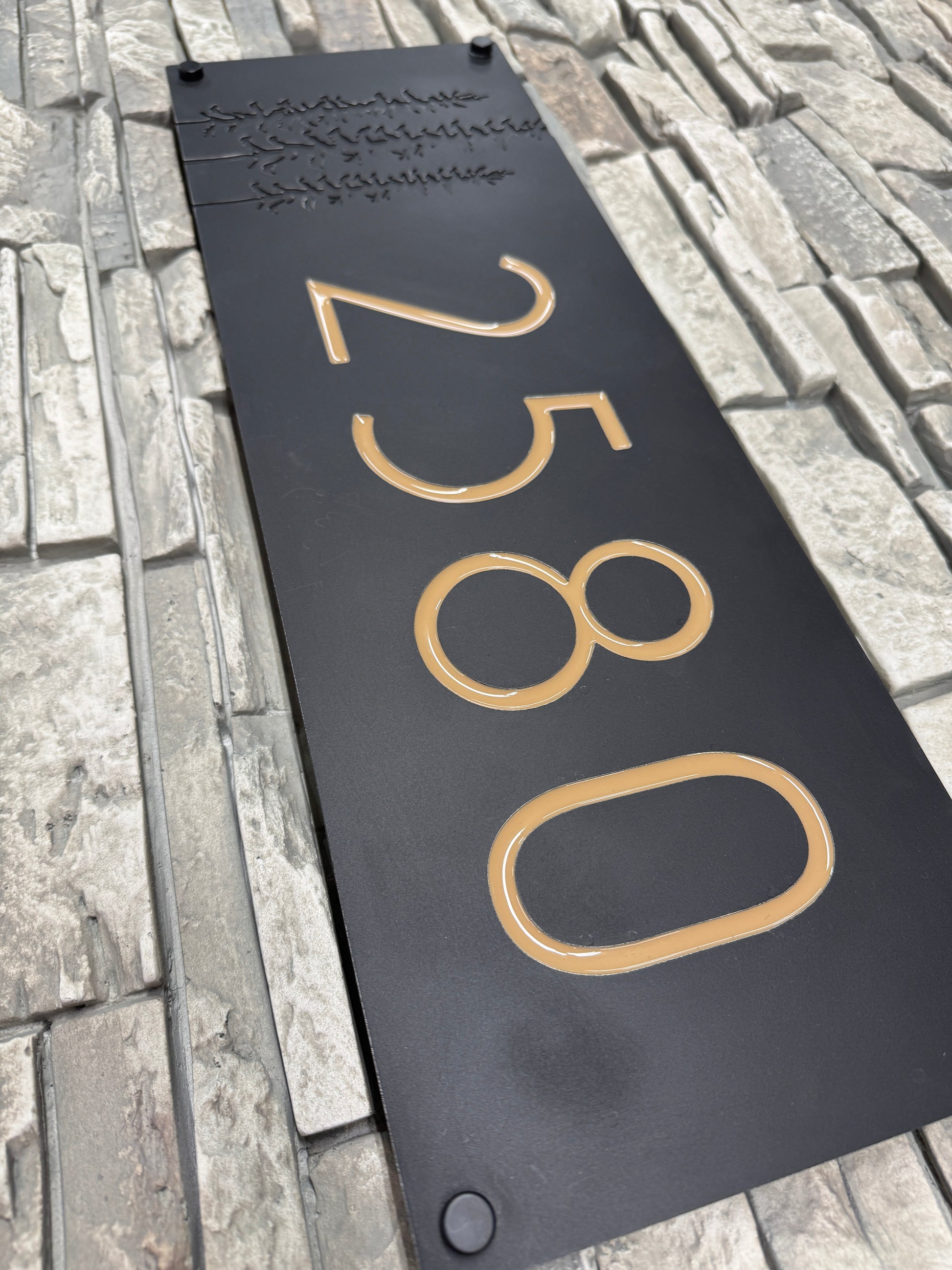 Black or brown metal plate finish with matte UV clearcoat applied. Design is lightly sand for a subtle appearance. Choose a resin color to make the numbers pop.